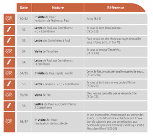Les échanges entre Paul et les Corinthiens furent nombreux et complexes, donnant lieu à au moins 5 lettres et 5 visites1. Le tableau page suivante tente de les résumer.