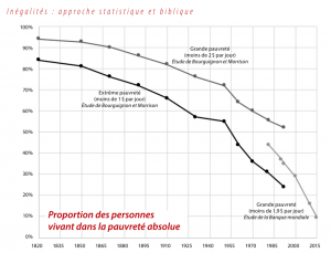 Si les constats précédents sont plutôt désespérants, il convient néanmoins de relever que la pauvreté a fortement reculé ces dernières décennies. En 25 ans (1990-2015), la proportion des personnes vivant en « absolue pauvreté »5 est passée de 37 % à 9,6 % des humains (soit quand même 700 millions de personnes de trop !). Sur une plus longue échelle, la réduction est encore plus spectaculaire :