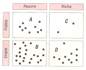 – il y a plus de pauvres qui se tournent vers Dieu que de riches (Mat 11.5) : A/(A+B) > C/(C+D) ;
