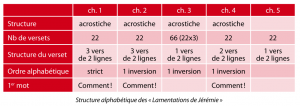 Le chapitre 5 est quelque peu différent ; il contient bien 22 versets, mais la lettre initiale de chaque verset ne suit plus l’ordre alphabétique. Même si ce chapitre n’est pas un acrostiche, le nombre de versets n’est sans doute pas une coïncidence !